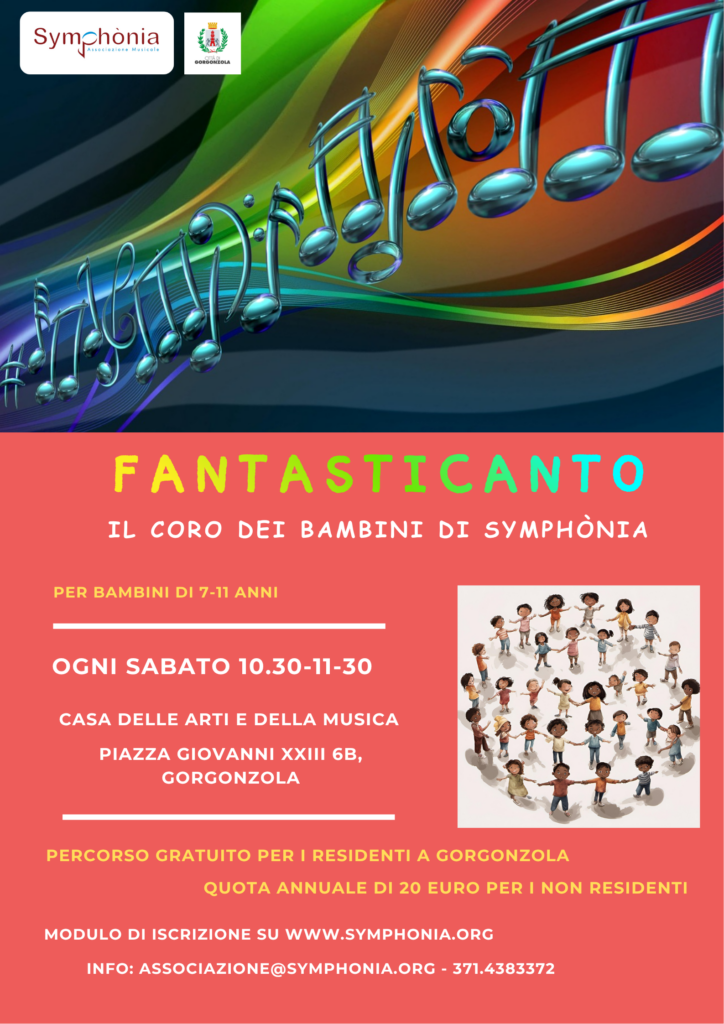 Fantasticanto, il coro dei bambini di Symphònia, si riunisce ogni sabato dalle 10.30 alle 11.30 presso la Casa delle Arti e della Musica in Piazza Giovanni XXIII 6B a Gorgonzola.